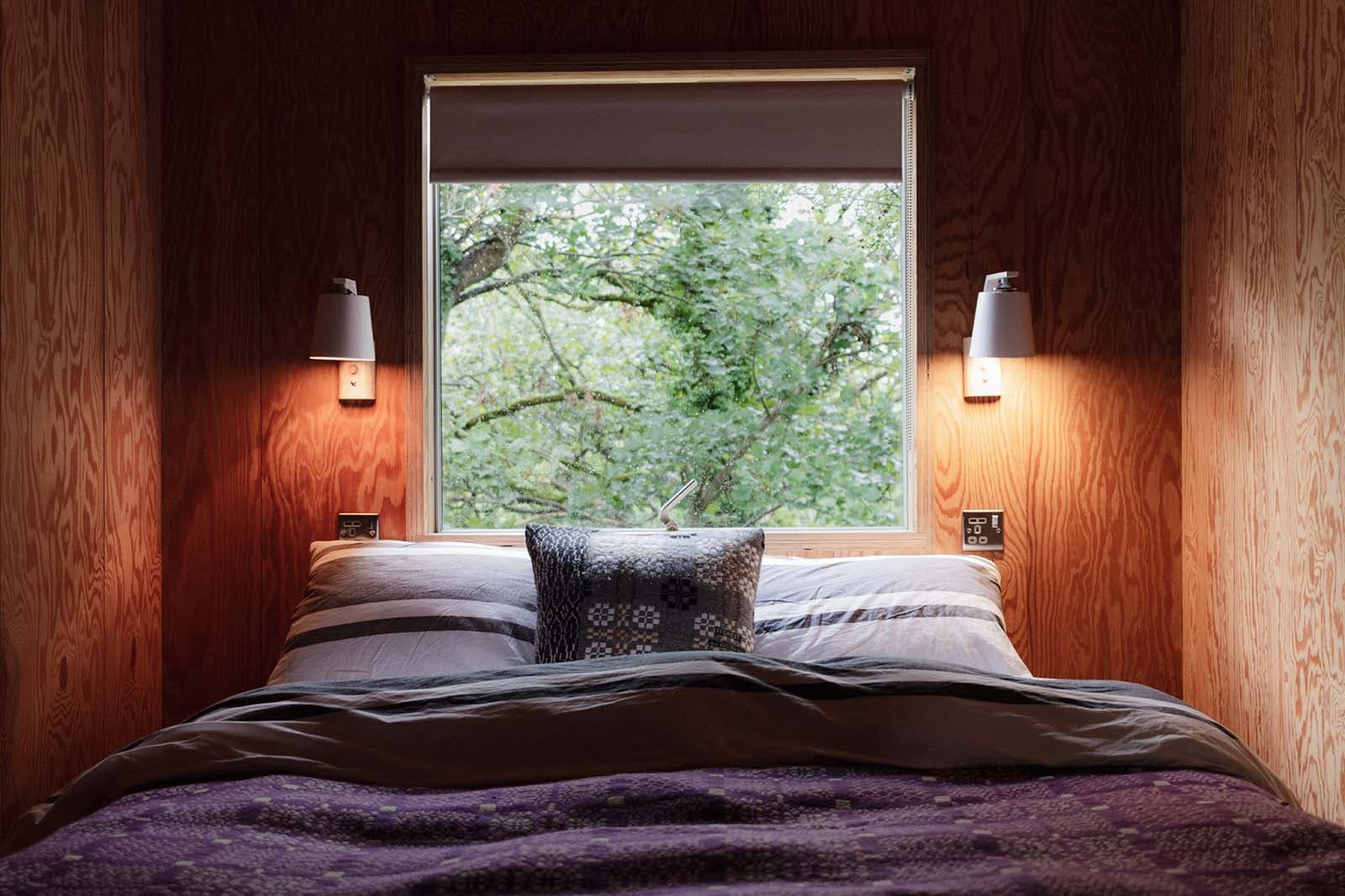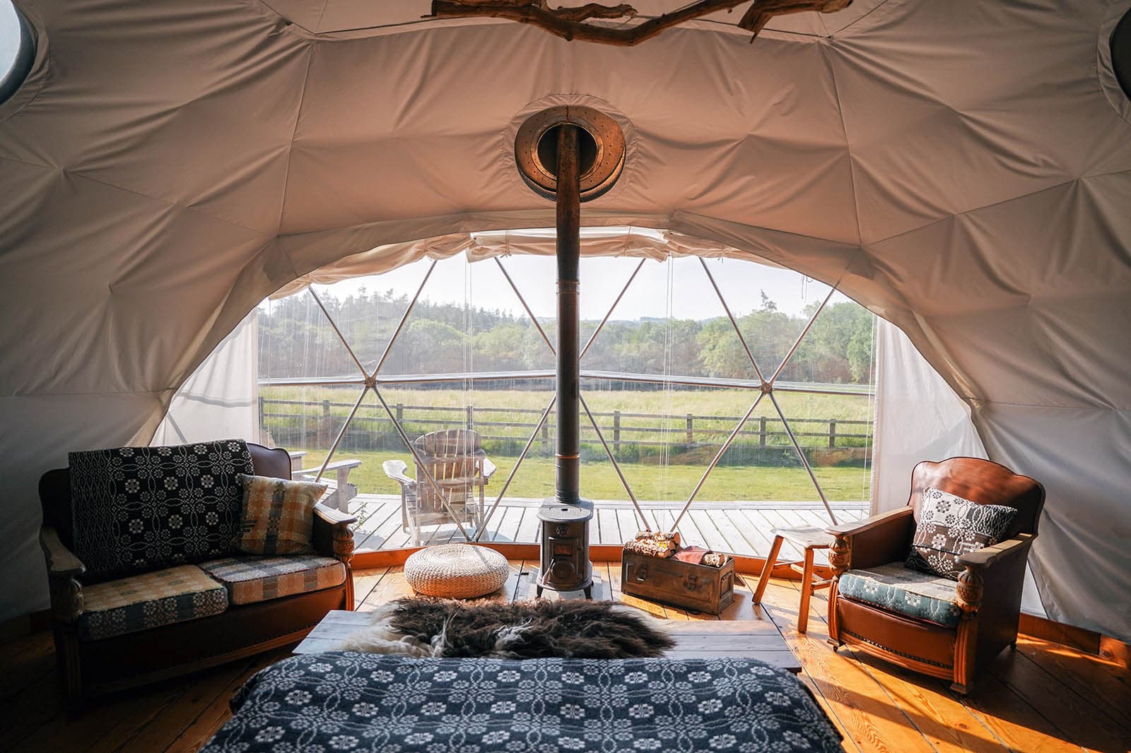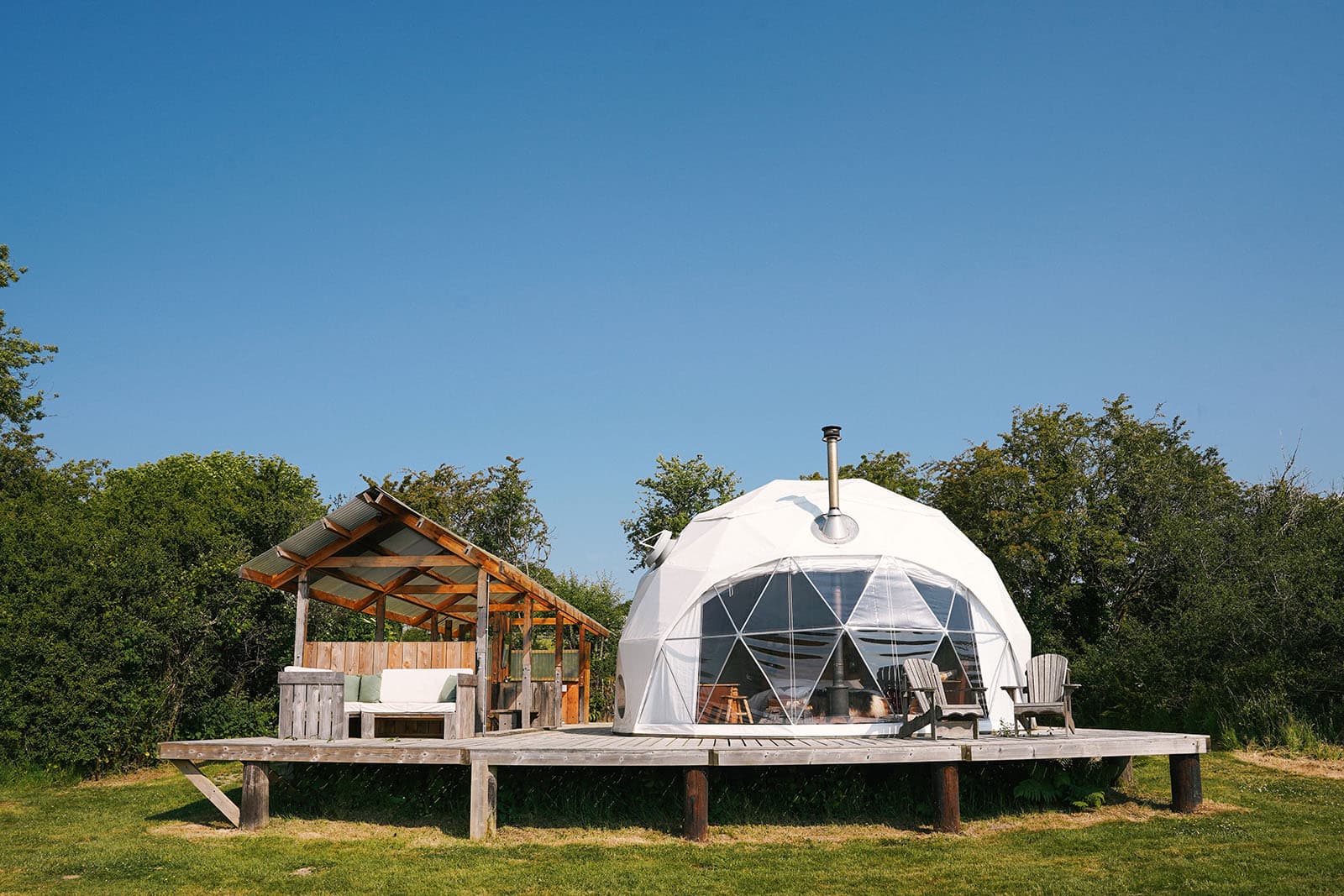 The dome, made famous at fforest, with its solid wood floor, wood-burning stove, bespoke furnishings and the view from that giant bay window. Each has its own individual surroundings in either a field or woodland setting. They have USB sockets, lighting, a king size bed, two single futon camp beds and are set on their own deck with a camp kitchen & seating area. A short walk to our cedar wood showers/toilets and beauty barn.